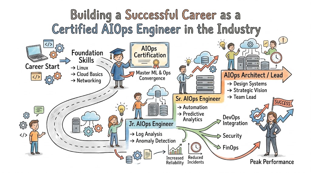 Enterprises continue to adopt hybrid cloud strategies, fueling a massive demand for professionals who can automate complex system observations. This certification ensures long-term career resilience because it focuses on universal data principles rather than a single vendor’s ecosystem. You stay relevant by mastering how to filter signal from noise, a skill that remains vital even as specific tools evolve. Moreover, implementing AIOps reduces “toil,” allowing you to focus on high-value innovation instead of repetitive maintenance tasks. Choosing this path represents a strategic investment in your professional longevity and earning potential.