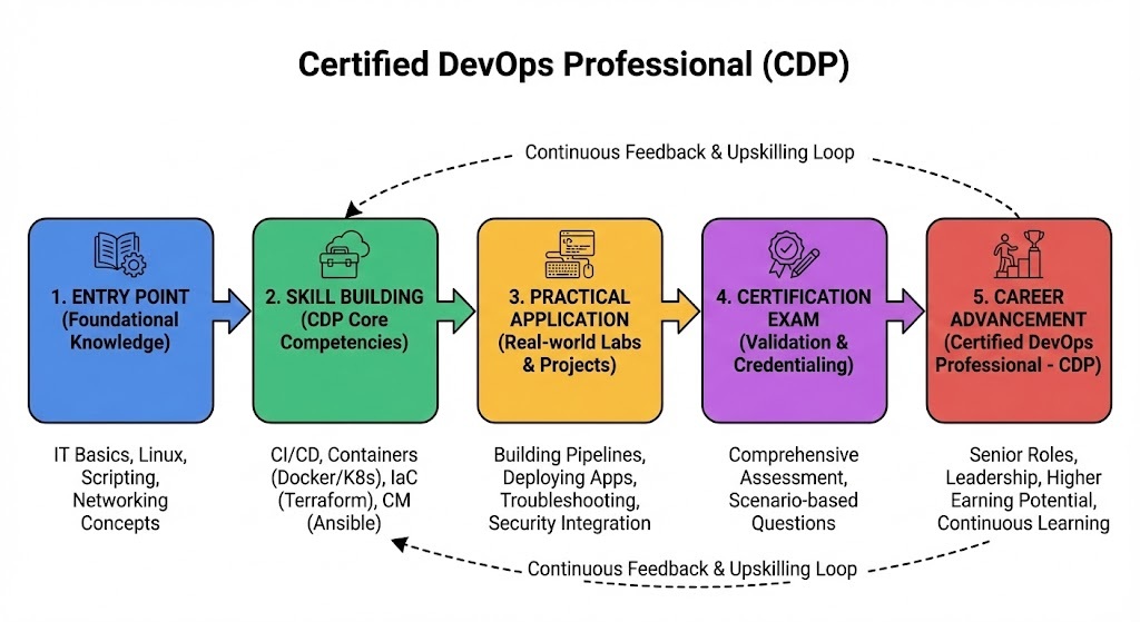 Cloud engineers and system administrators who want to move beyond manual provisioning find immense value in the Certified DevOps Professional (CDP) path. Software developers looking to take ownership of deployment pipelines also benefit significantly by learning the operational side of the software lifecycle. Additionally, Site Reliability Engineers (SREs) use this certification to formalize knowledge of automation and system resilience. The certification caters to a diverse global audience, including the booming tech sectors in India where large-scale digital transformation is a priority. Technical leaders and engineering managers should also consider this track to better understand the capabilities and constraints of the teams they lead. Whether you are an early-career engineer building a first CI/CD pipeline or a seasoned professional seeking to standardize skills, this certification provides the necessary technical depth and professional recognition.