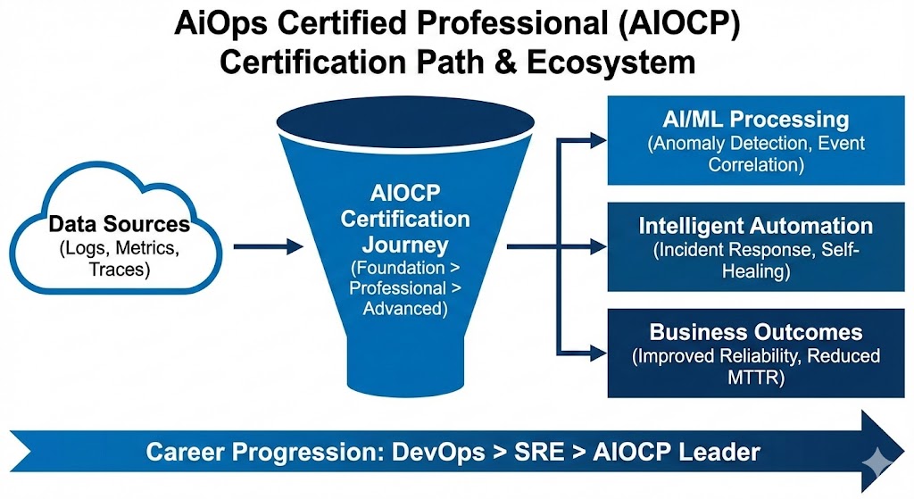 The modern IT landscape demands a shift from reactive monitoring to proactive, intelligent operations. This guide explores the AiOps Certified Professional (AIOCP) program, a comprehensive credential designed for engineers navigating the intersection of artificial intelligence and systems reliability. As enterprises scale their cloud-native environments, traditional manual intervention becomes a bottleneck, making AI-driven insights a necessity rather than a luxury. By following this roadmap, DevOpsSchool helps professionals understand how to integrate machine learning into their operational workflows to reduce noise and accelerate incident resolution. Whether you are an SRE looking to automate root cause analysis or a manager aiming to optimize infrastructure costs, this guide provides the clarity needed to make informed career decisions in the evolving world of platform engineering.